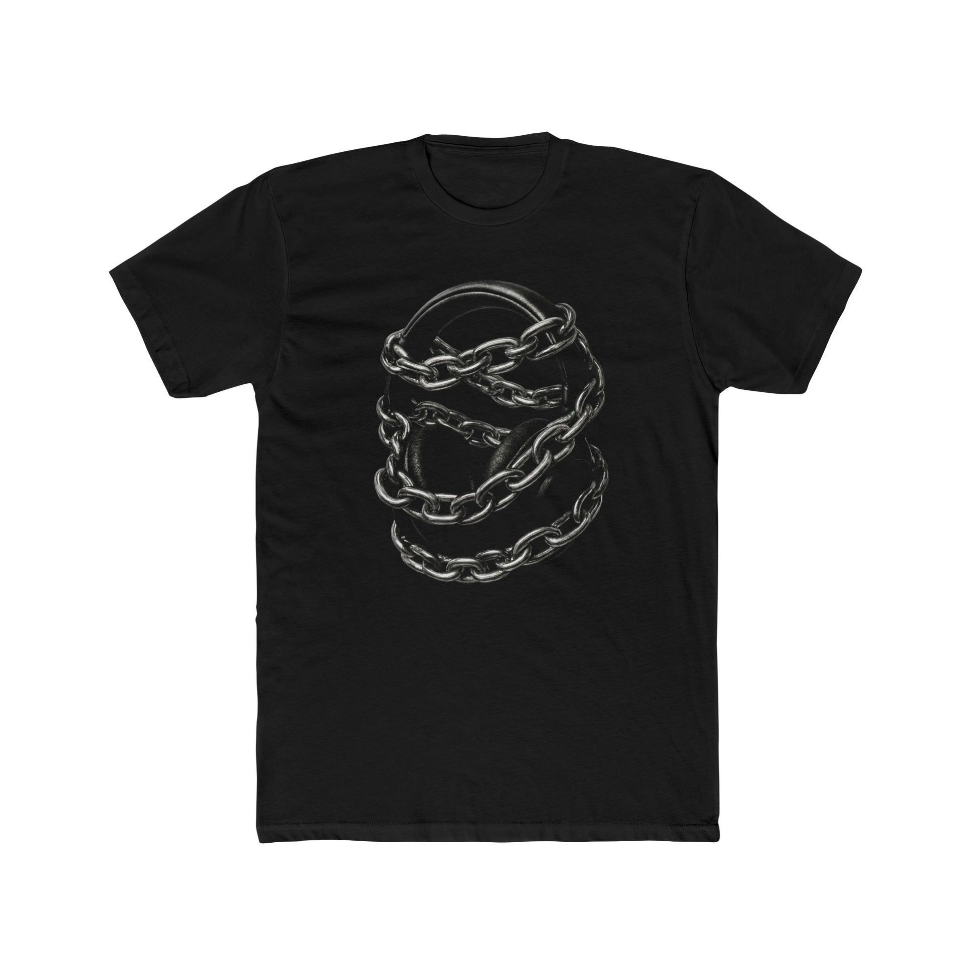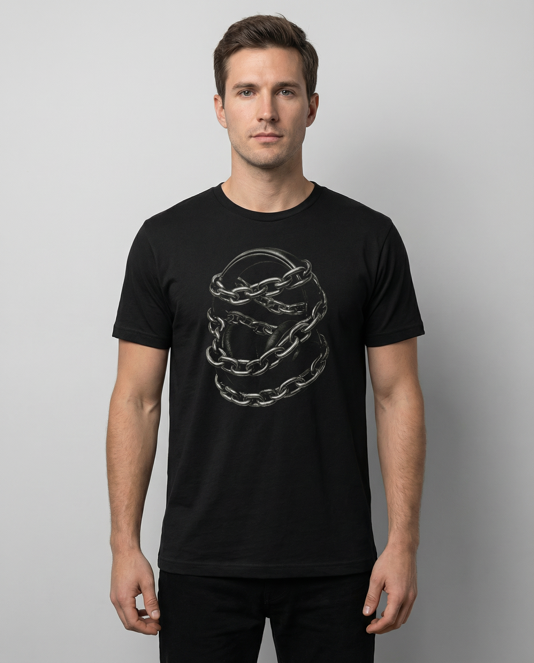 A soft, lightweight cotton crew tee with a moody edge: a coiled, photorealistic chain print sits over the chest like a captured moment. The black fabric makes the silvery links pop, giving the shirt a tactile, slightly industrial feel. Wear it solo with worn denim or layered under an open flannel for evenings when you want to look untamed but considered. The fitted crew neck and classic cut keep the silhouette clean while the detailed sleeve print (DTF transfer) adds a subtle designer touch that reads handcrafted. Built for everyday wear with reinforced seams and shoulder tape, this tee ages gracefully and keeps its shape through repeat wears and washes.